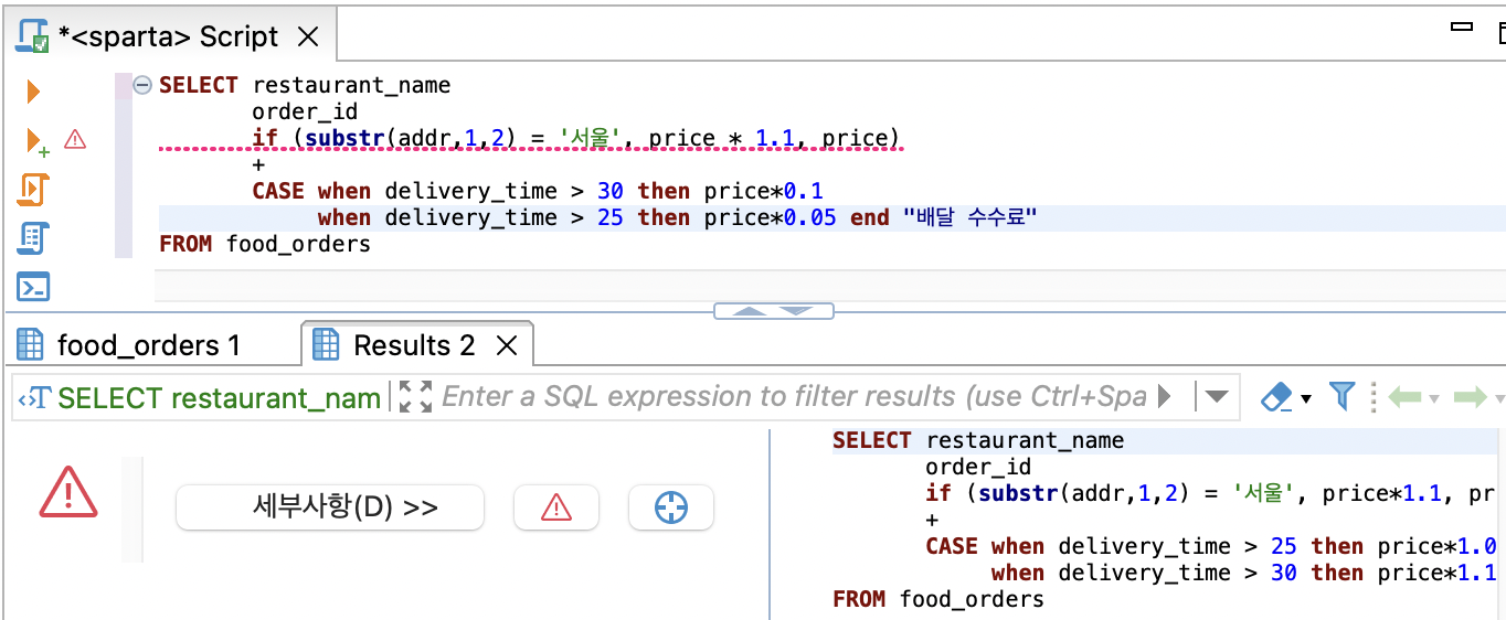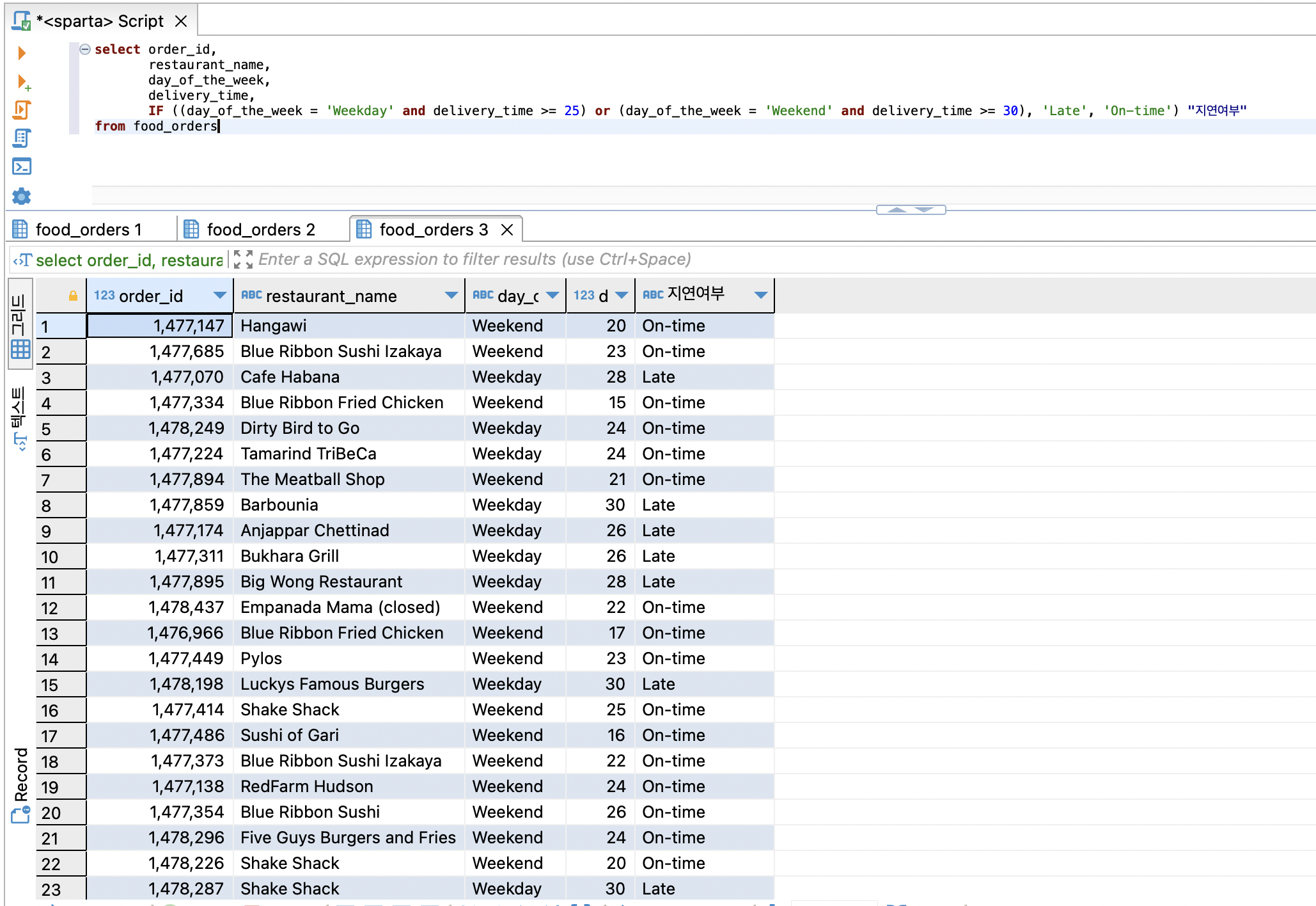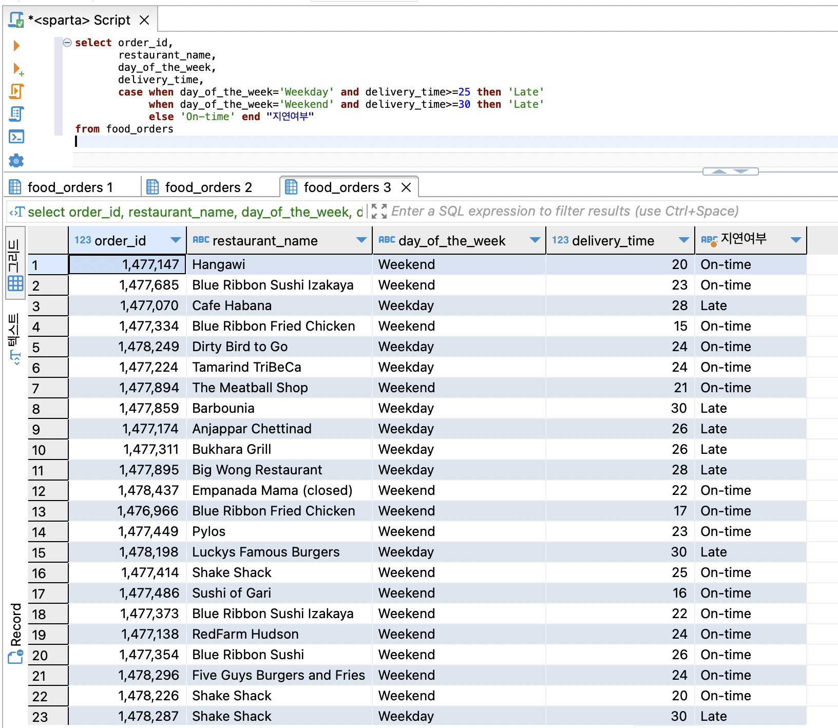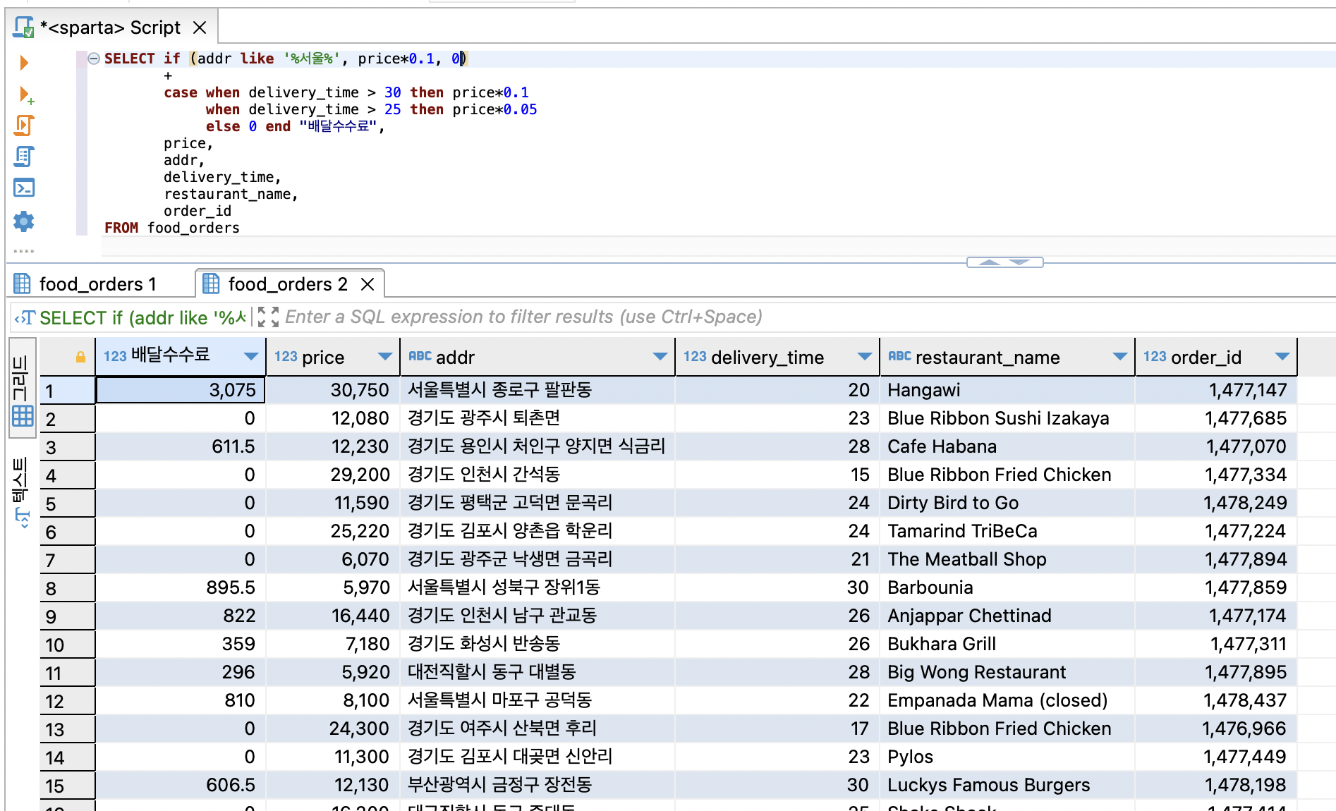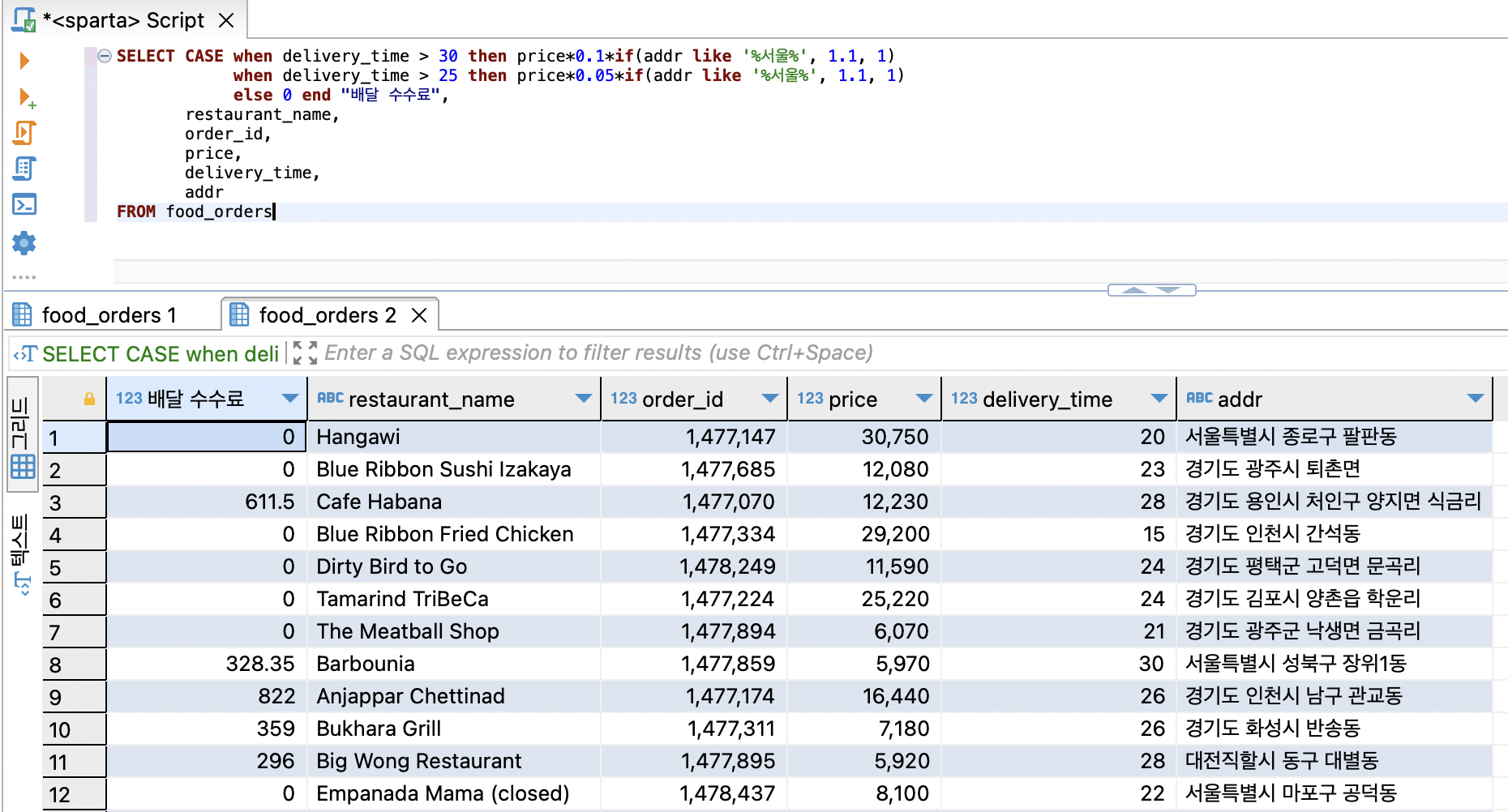 1) [실습] 지역과 배달시간을 기반으로 배달수수료 구하기 (식당 이름, 주문 번호 함께 출력)
