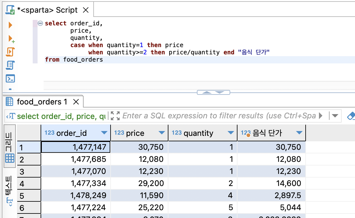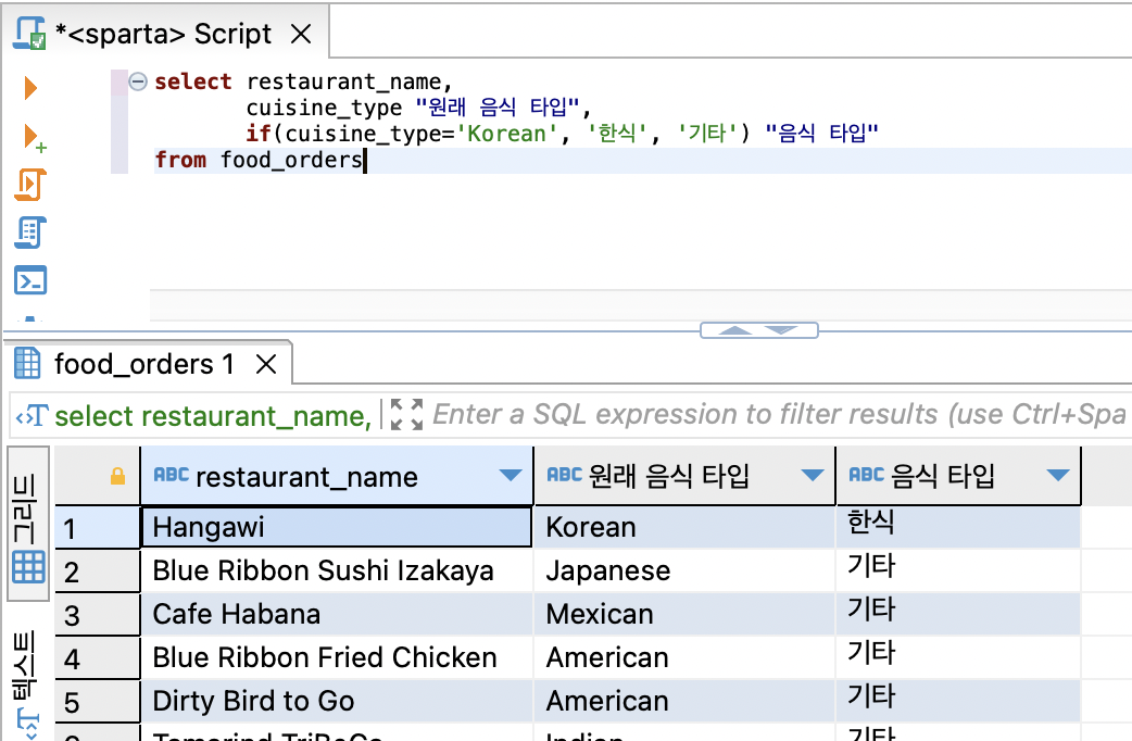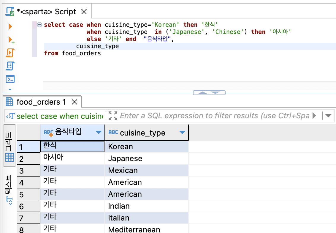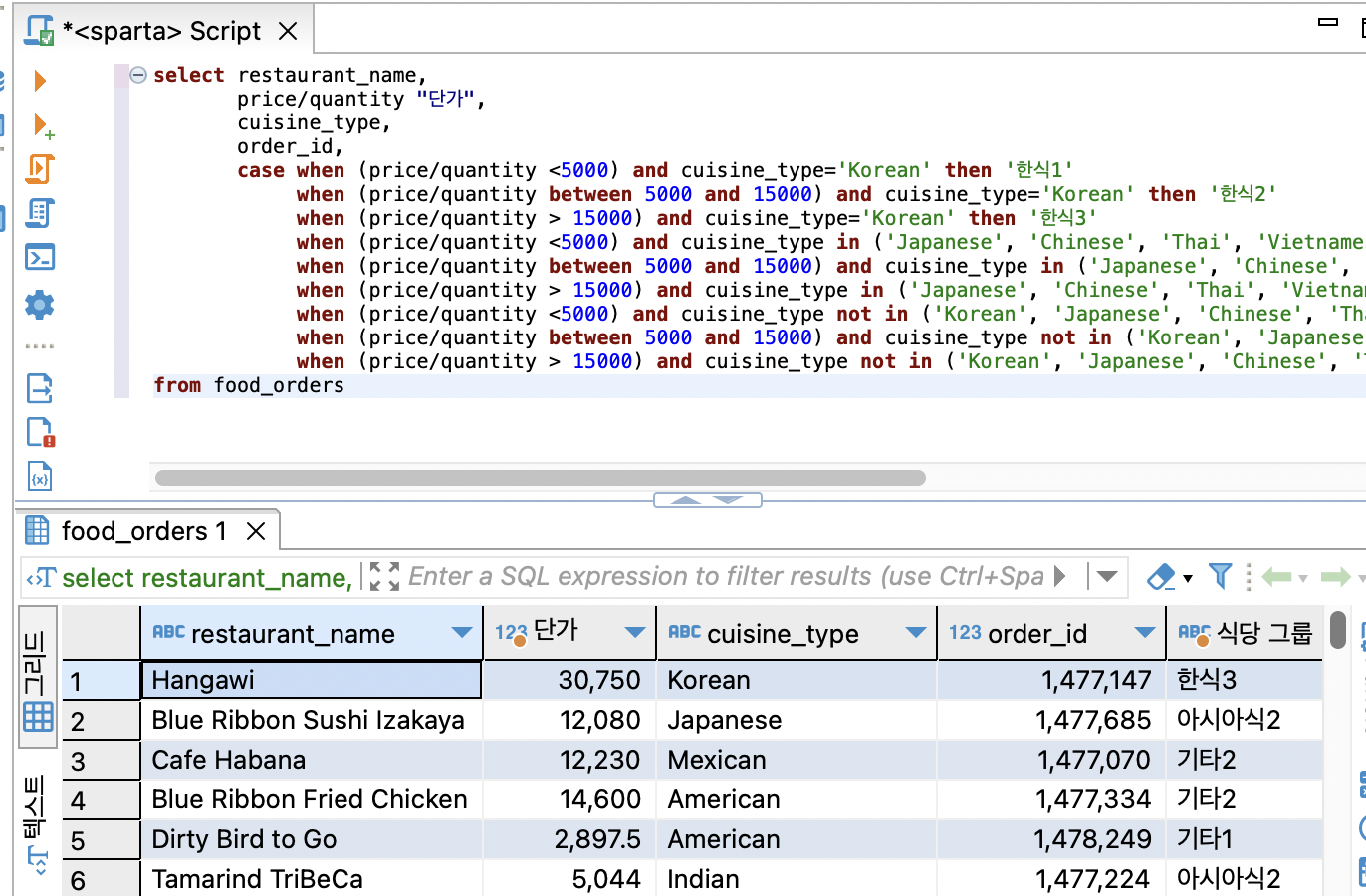 음식단가별, 음식종류별 2가지 조건이 혼합되어 음식종류의 기타에 대해 단순 else를 적용할 수 없음.