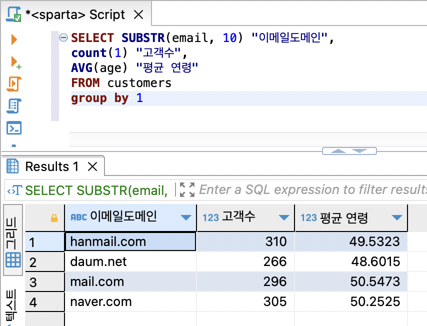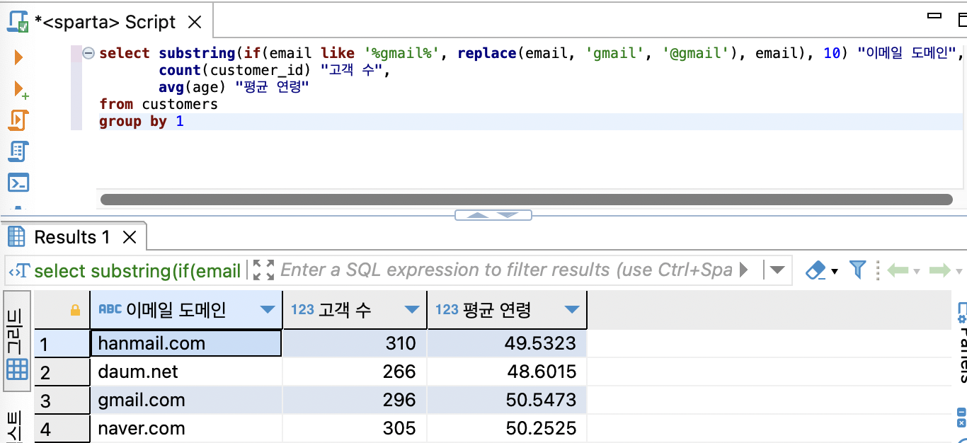 2) [실습] 이메일 도메인별 고객 수와 평균 연령 구하기