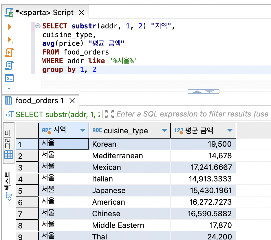 1) [실습] 서울 지역의 음식 타입별 평균 음식 주문금액 구하기 (출력: '서울', '타입', '평균 금액')
