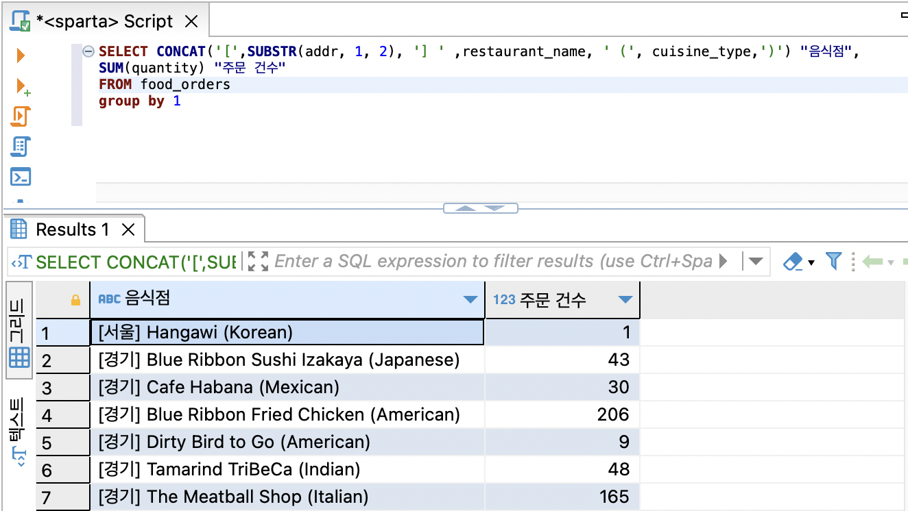 3) [실습] '[지역(시도)] 음식점이름 (음식종류)' 컬럼을 만들고, 총 주문건수 구하기