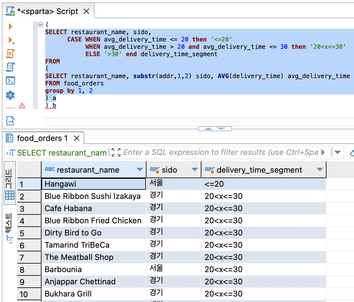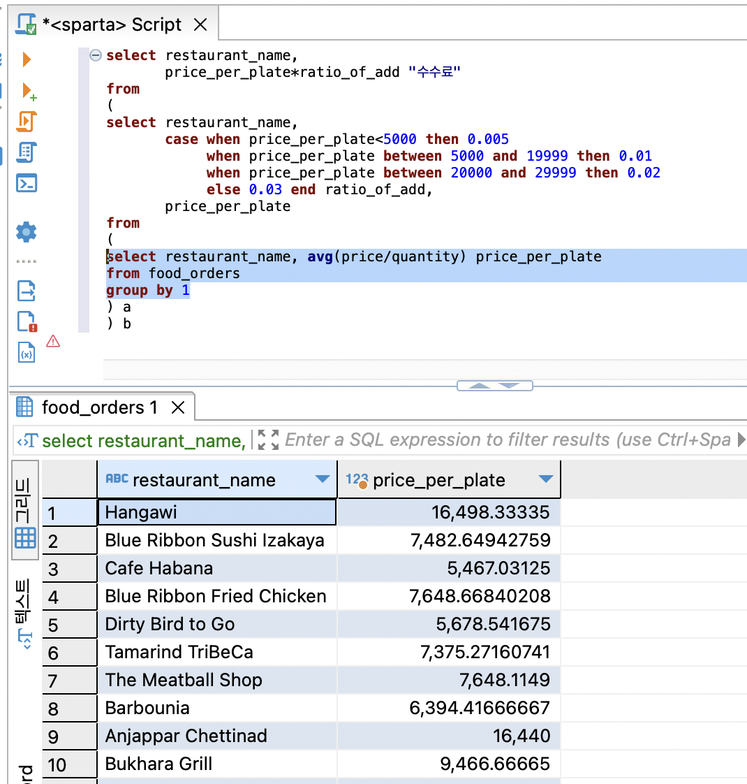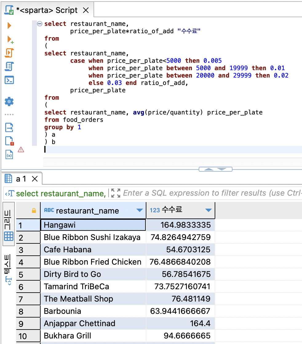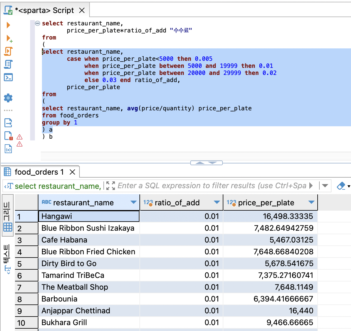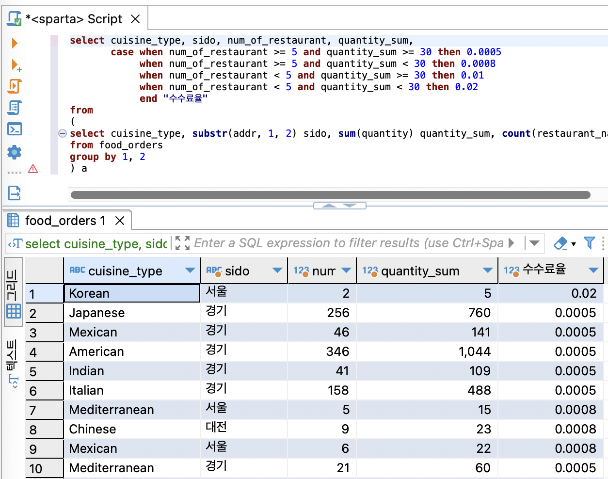 1) [실습] 음식 타입별 지역별 총 주문수량과 음식점 수를 연산하고, 주문수량과 음식점수 별 수수료율 산정하기