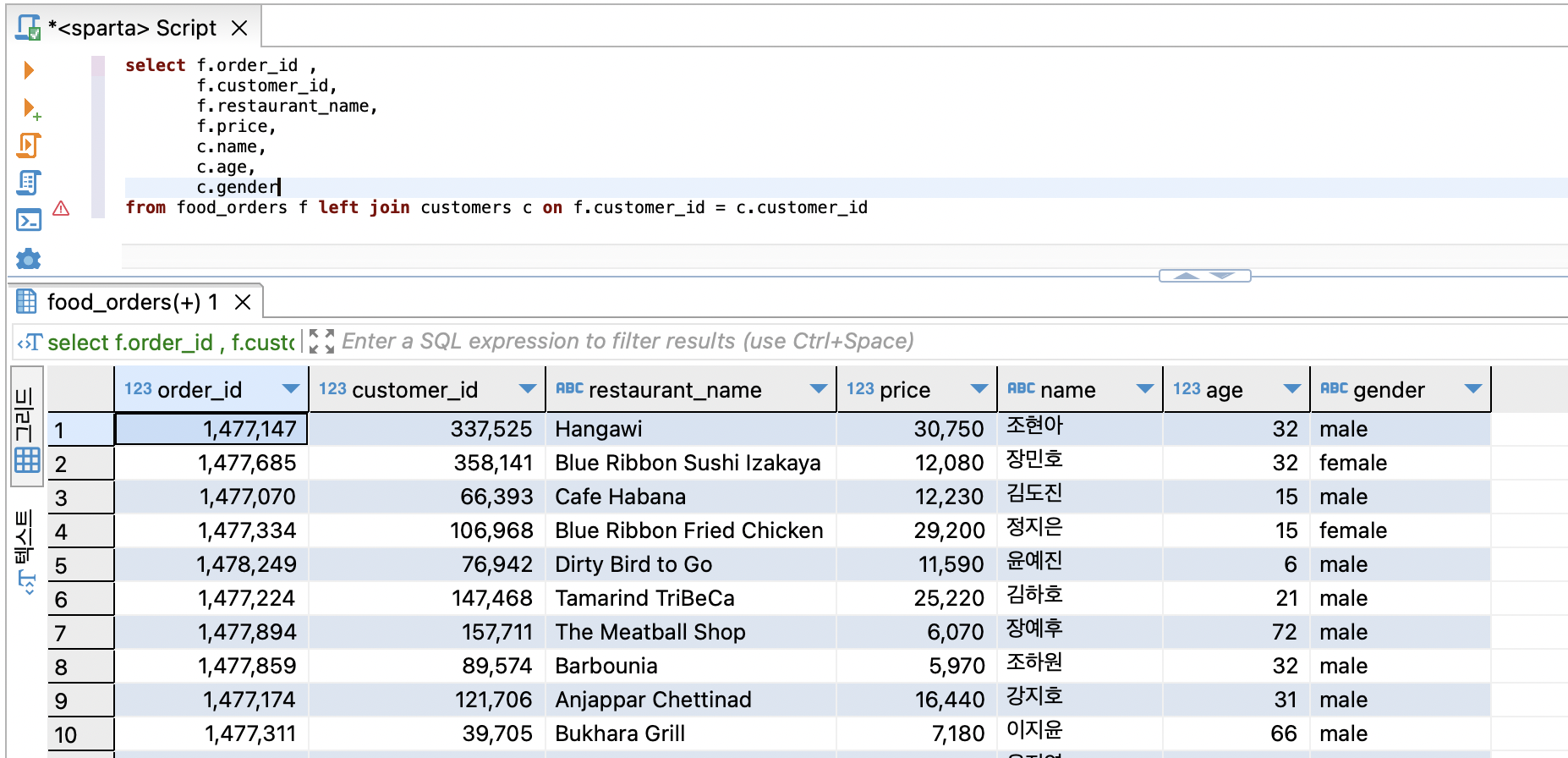 (조회 컬럼: order_id, customer_id, restaurant_name, price, name, age, gender)