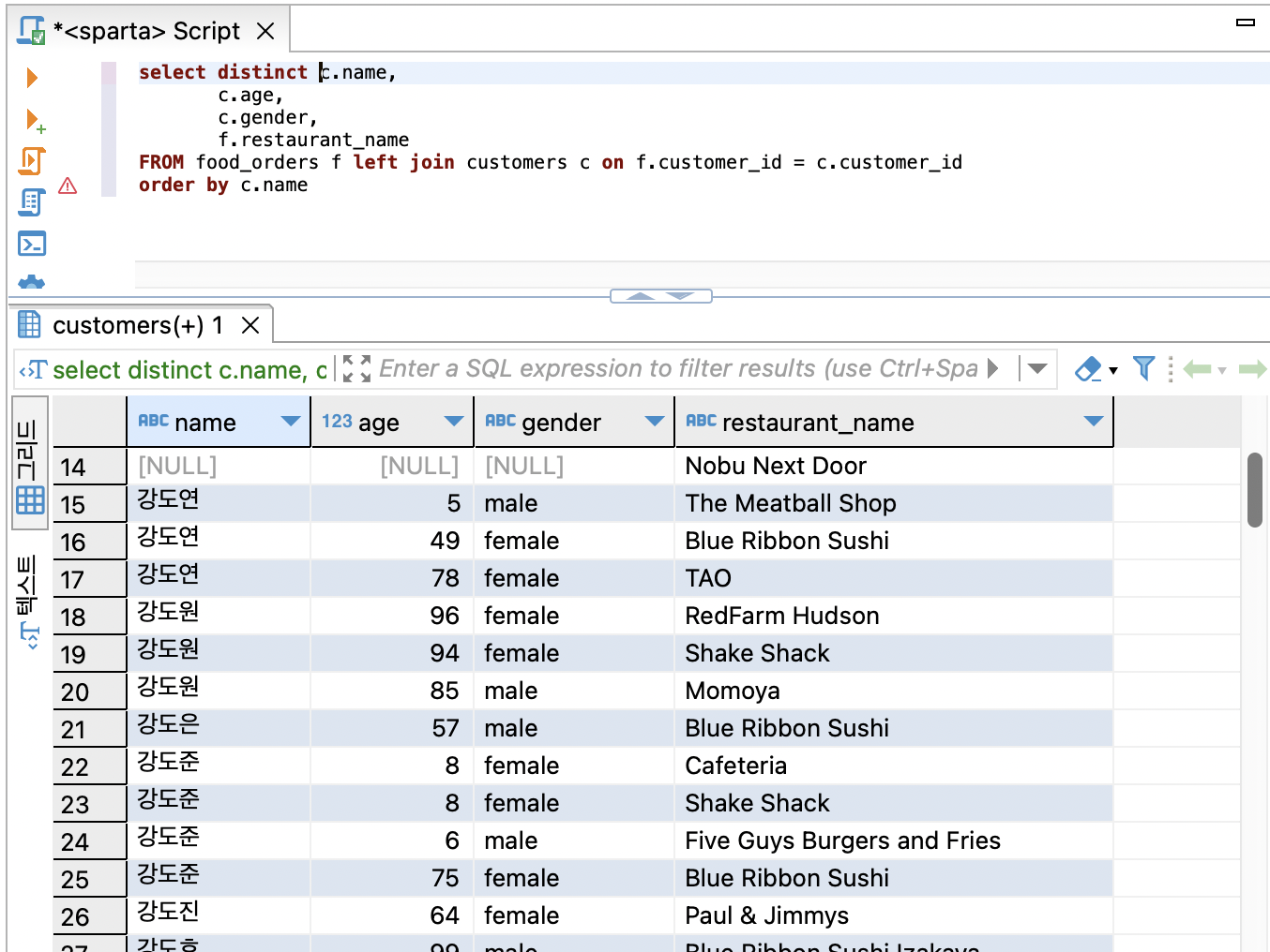 (조회 컬럼 : 고객 이름c.name, 연령c.age, 성별c.gender, 주문 식당f.restaurant_name)