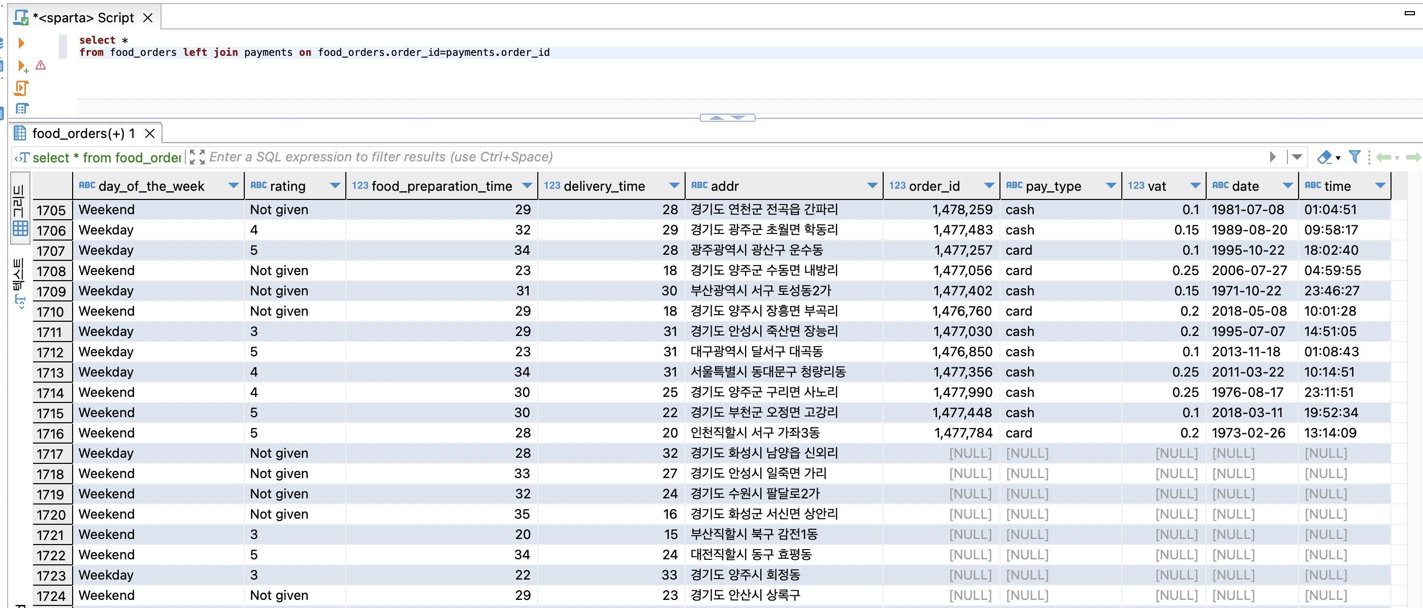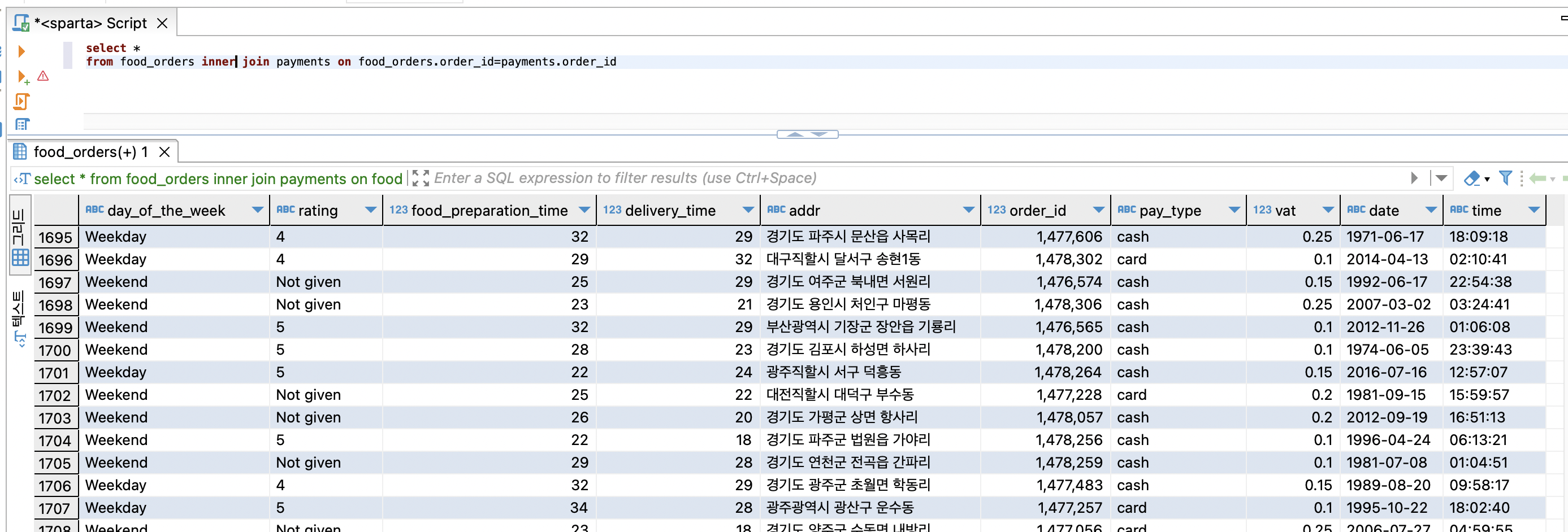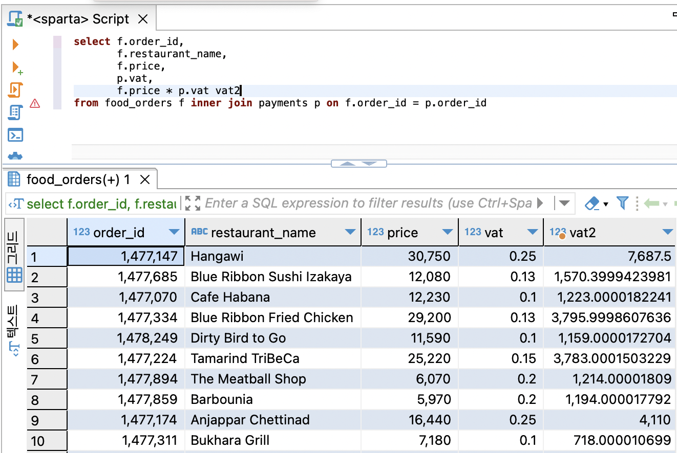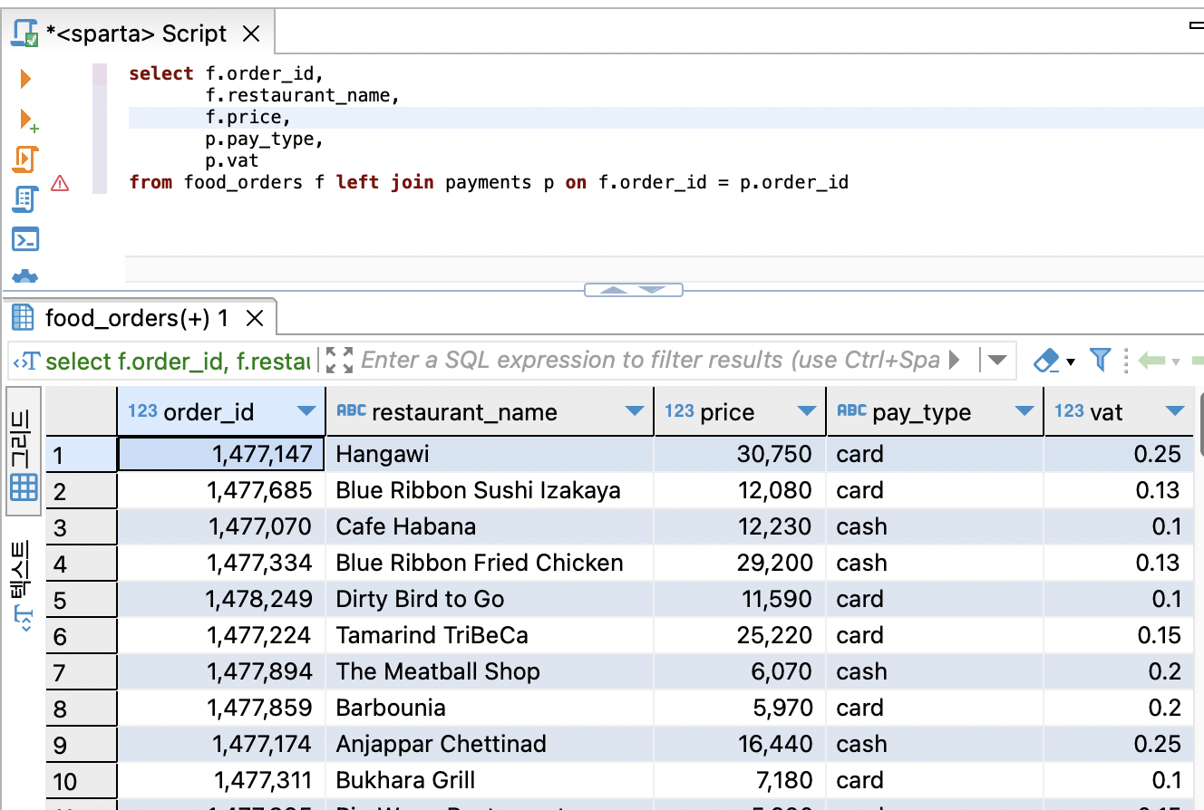 1) [실습] 한국 음식의 주문별 결제 수단과 수수료율을 조회하기