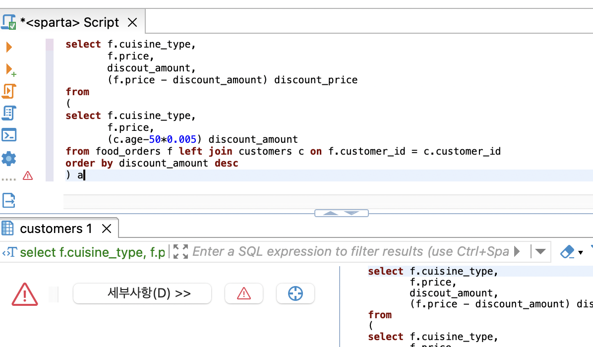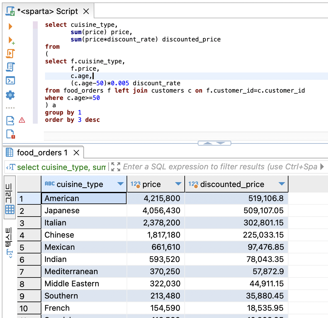 2) [실습] 50세 이상 고객의 연령에 따라 경로 할인율을 적용하고, 음식 타입별로 원래 가격과 할인 적용 가격 합을 구하기