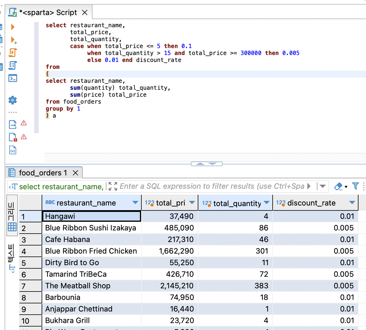 2) [실습] 음식점의 총 주문수량과 주문 금액을 연산하고, 주문 수량을 기반으로 수수료 할인율 구하기