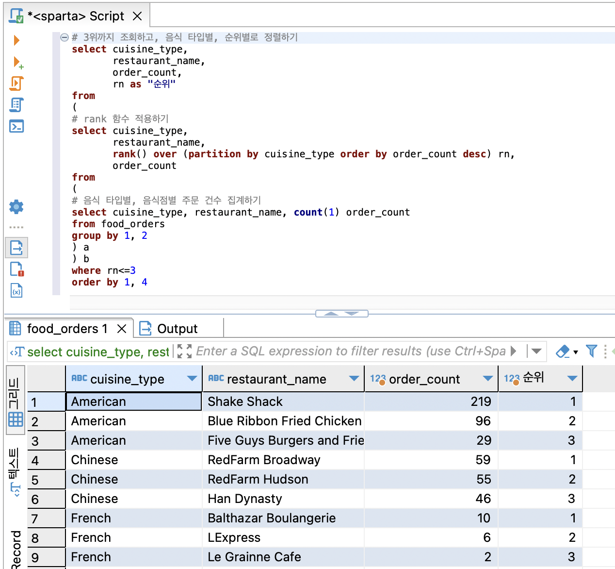 [실습] 음식 타입별로 주문 건수가 가장 많은 상점 3개씩 조회하기