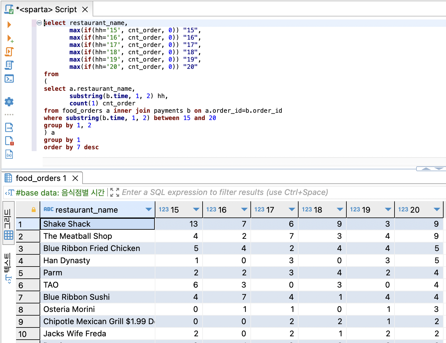 1) [실습] 음식점별 시간별 주문건수 Pivot Table 뷰 만들기 (15~20시 사이, 20시 주문건수 기준 내림차순)