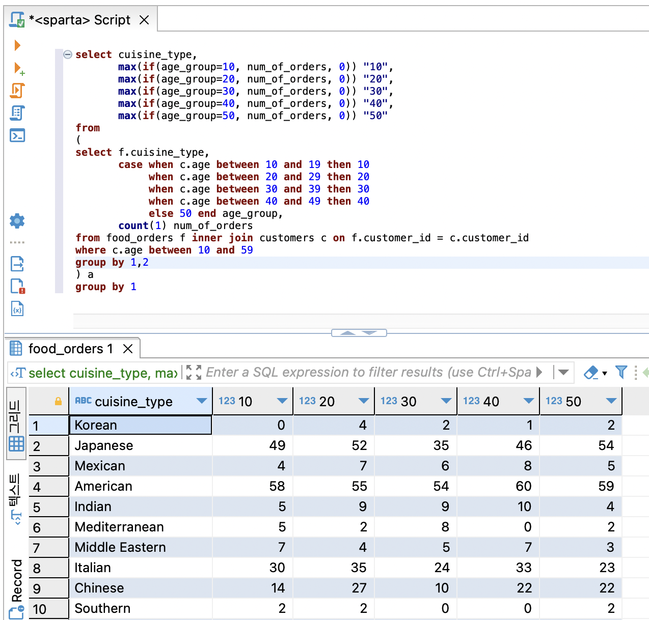 숙제 음식 타입별, 연령별 주문건수 pivot view 만들기