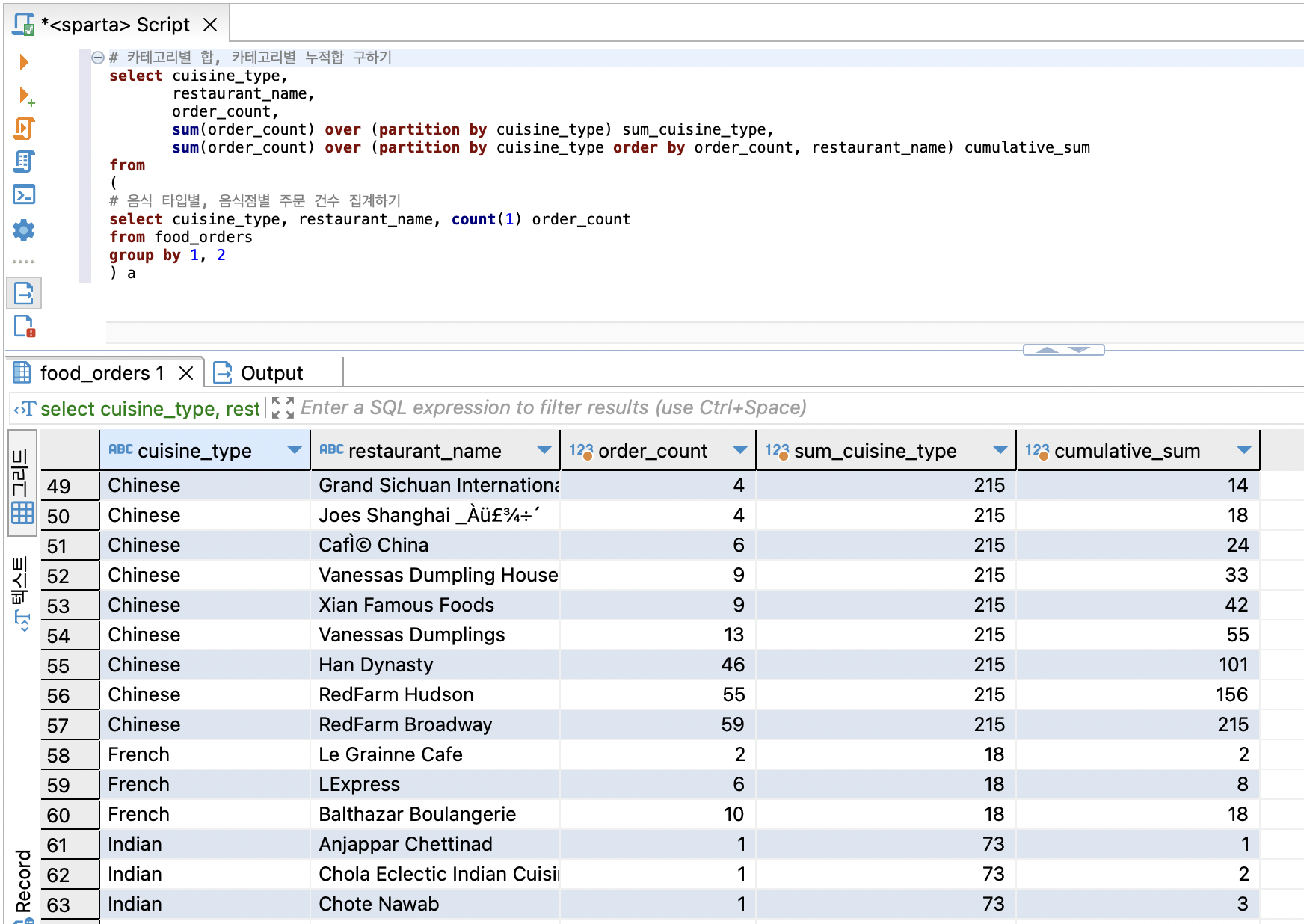 [실습] 각 음식점의 주문건이 해당 음식 타입에서 차지하는 비율을 구하고, 주문건이 낮은 순으로 정렬했을 때 누적 합 구하기